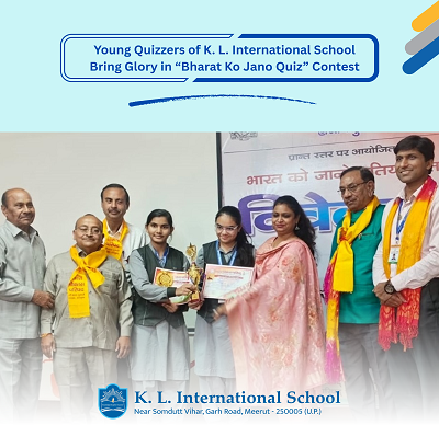 The young intellectuals of K. L. International School once again brought laurels to the institution with their stellar performance in the “Bharat Ko Jano Quiz”, organized by Bharat Vikas Parishad, Meerut Utkarsh Branch. Showcasing their deep knowledge, sharp intellect, and quick wit, the students illuminated the name of the school with immense pride.