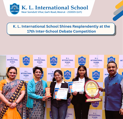K. L. International School etched an extraordinary achievement at the 17th Inter-School Debate Competition hosted by Guru Teg Bahadur Public School, Meerut, where nearly 40 eminent institutions competed fiercely and presented their arguments for and against the thought-provoking motion “Today’s Generation Learns More from Trends than Ideals.”